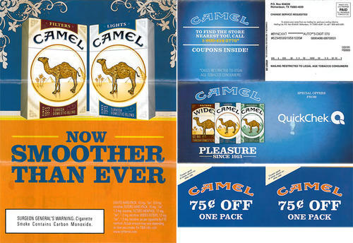 Direct mail received in the summer of 2008 in promotion of the update to Camel's cigarette packs and blends. "Now Smoother Than Ever". Piece is in joint promotion with Quick Check convenience stores, providing two cigarette coupons good at all participating Quick Check locations. Piece also includes two coupons for other store items (six inch sub and iced coffee).