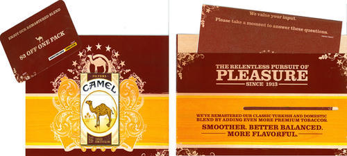 Direct mail received in promotion of the update to Camel's cigarette packs and blends. Text: "Your favorite Camels just got even better."..."We've remastered our classic Turkish and domestic blend by adding even more premium tobaccos. Smoother. Better balanced. More flavorful." Piece comes with a coupon for $3.00 off a pack, and a short survey update card.