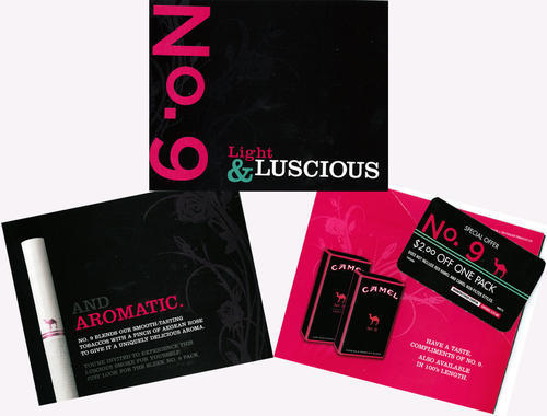 Direct mail from Camel received in February 2008 in promotion of the Camel No.9 line. Features an image of the black and pink packs and a close up image of a single cigarette (including a pink camel logo on the filter tip). A coupon for $2.00 off a pack is also included. Text: "No.9 Light & Luscious And Aromatic. No.9 blends our smooth-tasting tobaccos with a pinch of Aegean rose to give it a uniquely delicious aroma. You're invited to experience this luscious smoke for yourself. Just look for the sleek No. 9 pack."