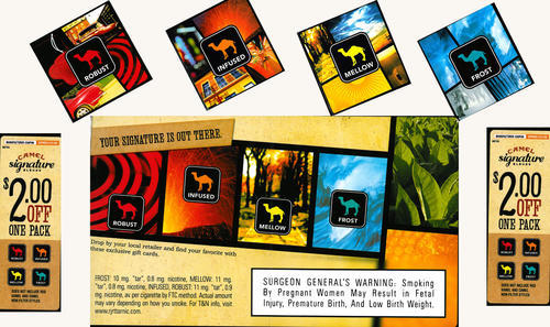 Direct mail from Camel in promotion of the Camel Signature Blends, a line of 4 flavor inflused blends developed with input from Camel customers. Text: Signature Blends are different than any smokes we've ever created - mostly because we didn't create them at all. Instead, over 60,000 of aour adult smokers stepped up and told us what THEY thought a really great cigarette should be. They sampled different tobaccos. They voted on their favorites. They even helped design some new packaging. All we had to do was sit back and listen. The result? Four exciting blends of premium tobaccos and unique ingredients." Two coupons for $2.00 off a pack included.