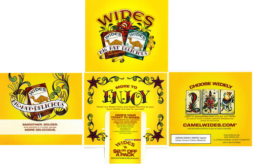 Direct mail received June 2008 in promotion of Camel Wides. Piece includes two coupons for $2.00 off a pack and an offer for a free lighter designed by tattoo artist PJ Ferrante (to be redeemed online). A brief feature on PJ Ferrante is also included and readers are directed to the Camel website to learn more about him.