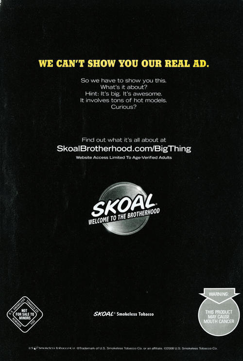 Ad from Skoal attempting to lure readers to visit Skoal's website, where they can learn about Skoal's promotion with Playboy magazine. Once registered online, users can vote for various features, including their favorite model, to be included in a special Skoal section of the January 2009 issue of Playboy. Ad text: "We can't show you our real ad. So we have to show you this. What's it about? Hint: It's big. It's awesome. It involves tons of hot models. Curious? Find out what it's all about at: SkoalBrotherhood.com/BigThing"