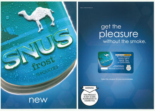 Two-sided ad insert in promotion of Frost flavored Camel Snus. Front side features an image of the tin with the word "new" underneath. Back side includes a removable coupon for a free tin of Camel Snus with the purchase of any tobacco product. Text: "Get the pleasure without the smoke."