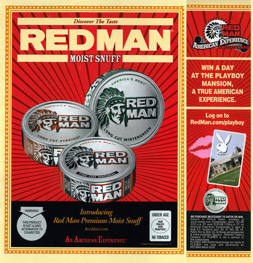 One and one-third page ad for Red Man moist snuff. Ad also promotes a sweepstakes for a trip to the Playboy Mansion, and directs readers to the brand's website for more information and to sign up.