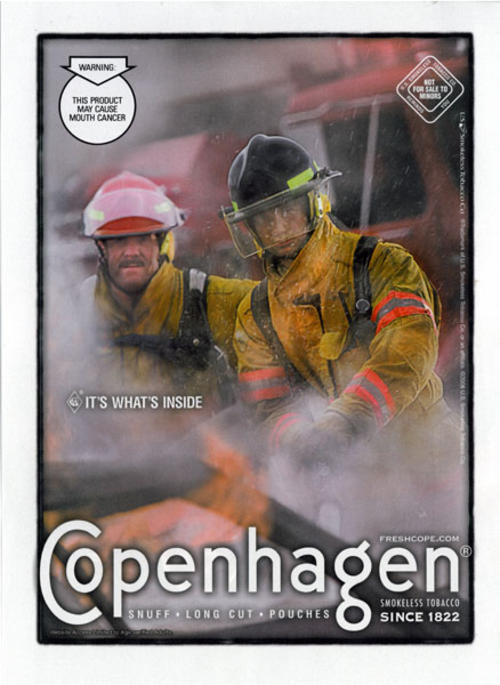 Copenhagen ad featuring an image of two firefighters. Slogan: "It's What's Inside"