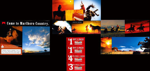 Poster styled direct mail from Marlboro featuring a montage of Marlboro cowboy and landscape images. Piece also included 4 coupons (2 x $1.00 off per pack coupons; 1 x $4.00 off 4 packs or 1 carton coupon; 1 x $3.00 off 4 packs or 1 carton coupon).