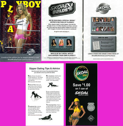 Direct mail from Skoal advertising a special joint promotion with Playboy magazine - a 12 page spread in the January 2009 issue of Playboy. Receivers are invited to visit Skoal's website to help develop the content for the spread by voting on models to feature, jokes to include, etc. Piece also comes with a list of "dipper dating tips & advice", and with a coupon for $1.00 off on one can of Skoal.