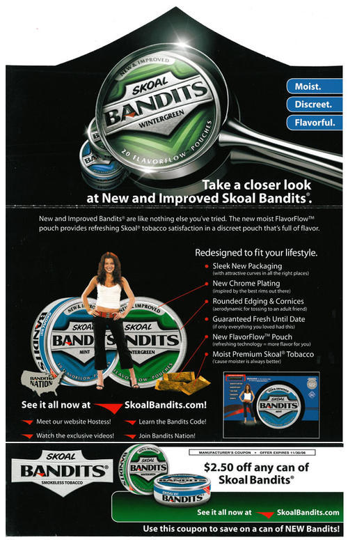 Direct mail from Skoal in promotion of the "new and improved" Skoal Bandits, available in Mint and Wintergreen flavors. Piece provides a list of the characteristics and advantages of the improved product and describes the bandits as sleek and discreet. The piece also directs receivers to the brand's website and includes a coupon for $2.50 off any can of Skoal Bandits.