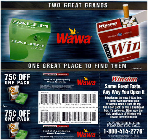 Direct mail advertising both Winston and Salem cigarettes in joint promotion with Wawa convenience stores, providing two cigarette coupons good at all participating Wawa locations. Piece also promotes the new design of the Winston pack, a "2-Way Box" that can be opened from the top like a soft pack, or like a traditional box.