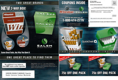 Direct mail advertising both Winston and Salem cigarettes in joint promotion with Quick Check convenience stores, providing two cigarette coupons good at all participating Quick Check locations. Piece also includes two additional coupons for Quick check food items. A near identical piece exists for a joint promotion with Wawa convenience stores.