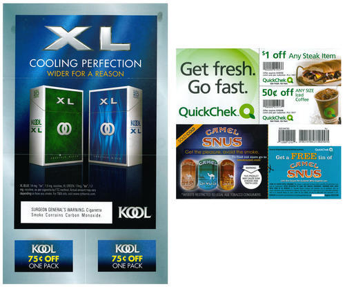 Direct mail received in promotion of Kool's XL wide style cigarettes. "Cooling perfection, wider for a reason". Piece is in joint promotion with Quick Check convenience stores, providing two cigarette coupons good at all participating Quick Check locations as well as two coupons for other store items (sub and iced coffee). In addition, the piece advertises and includes a coupon for a free tin of Camel Snus, also good at participating Quick Check stores.