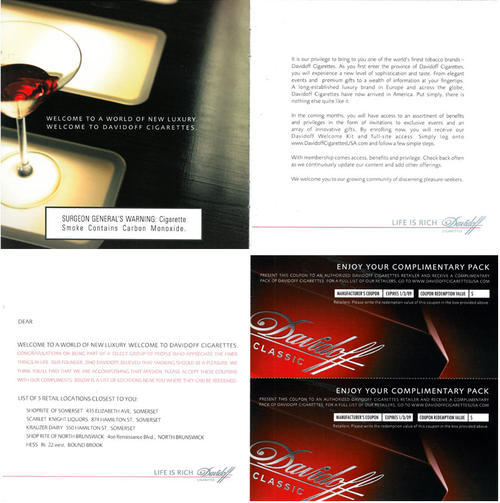 Direct mail from Davidoff, with a small booklet describing the new brand and with two coupons for a free pack of Davidoff cigarettes included. The piece also provides a list of stores near the receiver's address that carry Davidoff cigarettes.