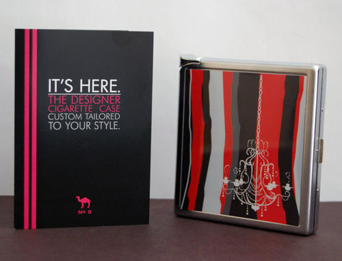 Direct mail from Camel featuring a free cigarette case, as offered in a previous mailing promoting Camel No.9 cigarettes. Text: "It's here. The designer cigarette case custom tailored to your style." Text inside card: "Thanks for the RSVP. Carry your light and luscious No. 9s around in style with this purse essential."