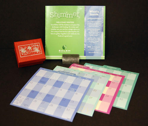 Winter holiday themed direct mail from Salem, advertising new winter features on the brand's website, includes a free picture holder gift along with several calendar/tips/recipe pages than can be placed in a box sent as a gift in a previous direct mail piece.
