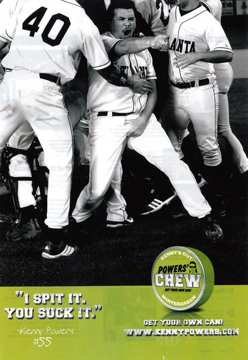 Ad for Powers' Chew, a smokeless tobacco product promoted by Kenny Powers, a fictional character on the HBO show, Eastbound & Down. The character of Kenny Powers, a former baseball player, is played by comedian Danny McBride. Ad text: "I spit it. You suck it. Get your own can! www.kennypowers.com" Ad found in Maxim, March 2009