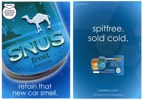 Two sided magazine ad in promotion of Frost flavored Camel Snus, featuring a large image of the tin package on the front side of the ad. The tin is covered with beads of water, a reference to the fact that the product is sold cold. Underneath the image are the words "retain that new car smell". On the back side of the ad is a coupon for a free tin of Camel Snus upon purchase of any tobacco product.