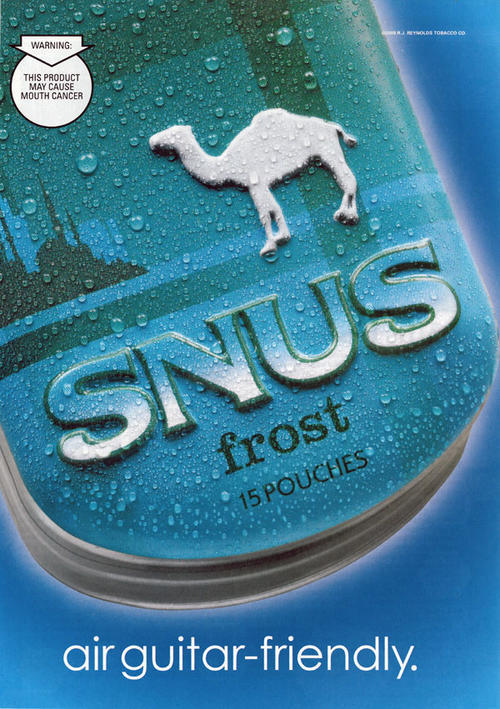Magazine ad in promotion of Frost flavored Camel Snus, featuring a large image of the tin package. The tin is covered with beads of water, a reference to the fact that the product is sold cold. Underneath the image are the words "air guitar-friendly".