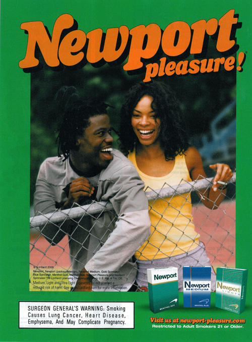 Ad for Newport cigarettes, featuring an image of an African American couple smoking, leaning on a fence outside, and laughing together.