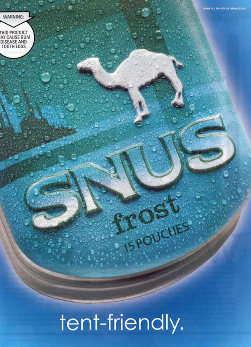 Magazine ad in promotion of Frost flavored Camel Snus, featuring a large image of the tin package. The tin is covered with beads of water, a reference to the fact that the product is sold cold. Underneath the image are the words "tent-friendly".