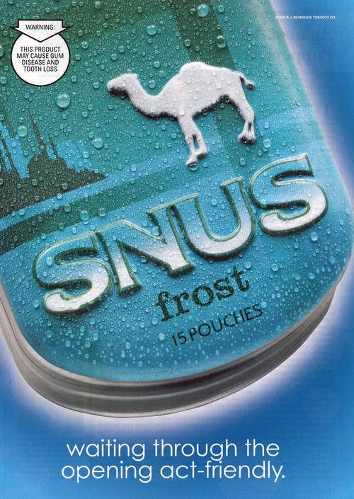 Magazine ad in promotion of Frost flavored Camel Snus, featuring a large image of the tin package. The tin is covered with beads of water, a reference to the fact that the product is sold cold. Underneath the image are the words "waiting through the opening act-friendly".
