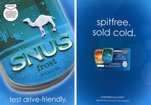 Two sided magazine ad in promotion of Frost flavored Camel Snus, featuring a large image of the tin package on the front side of the ad. The tin is covered with beads of water, a reference to the fact that the product is sold cold. Underneath the image are the words "test drive-friendly." On the back side of the ad is a coupon for a free tin of Camel Snus upon purchase of any tobacco product.