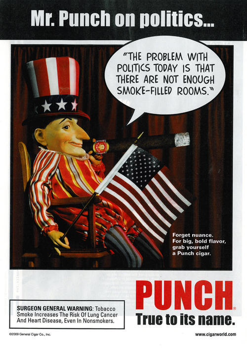 Ad for Punch cigars, featuring an image and quote from the character, "Mr. Punch on politics..." "The problem with politics today is that there are not enough smoke-filled rooms." Other ad text: "Forget nuance. For big, bold flavor, grab yourself a Punch cigar. Punch. True to its name."