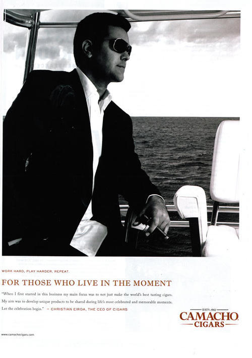 Magazine ad for Camacho cigars, featuring a black and white image of a man in a suit smoking a cigar on a boat.
