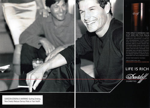 Two page ad from existing cigar brand, Davidoff, promoting new Davidoff cigarettes, presented in a uniquely shaped red pack. Ad features an image of a young man sitting, smoking and laughing, with other people in the background.