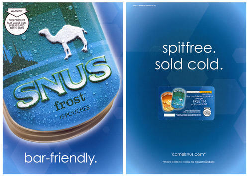 Two sided magazine ad in promotion of Frost flavored Camel Snus, featuring a large image of the tin package on the front side of the ad. The tin is covered with beads of water, a reference to the fact that the product is sold cold. Underneath the image are the words "bar-friendly." On the back side of the ad is a coupon for a free tin of Camel Snus upon purchase of any tobacco product.