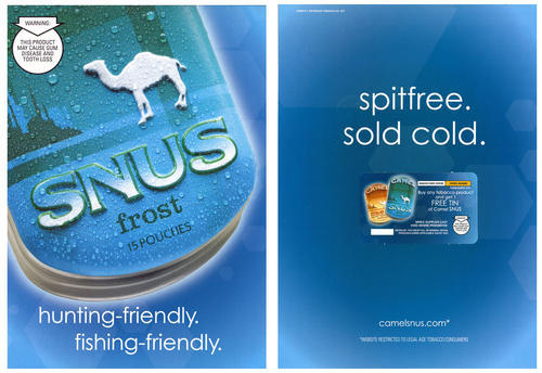 Two sided magazine ad in promotion of Frost flavored Camel Snus, featuring a large image of the tin package on the front side of the ad. The tin is covered with beads of water, a reference to the fact that the product is sold cold. Underneath the image are the words "hunting-friendly. fishing-friendly." On the back side of the ad is a coupon for a free tin of Camel Snus upon purchase of any tobacco product.