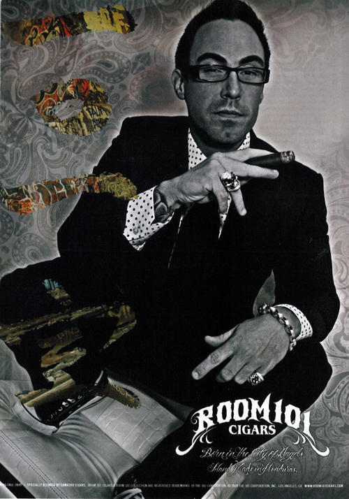 Ad for Room 101 cigars featuring an image of a man with a polka dot shirt and a skull ring smoking a cigar.