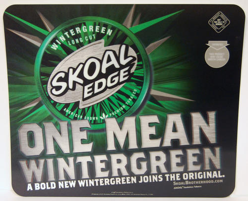 Point-of-sale counter mat in promotion of Skoal Edge, "One Mean Wintergreen" flavored smokeless tobacco. The counter mat has a shiny hologram-like quality.