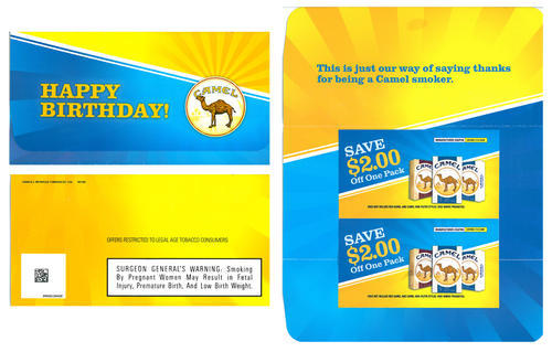 Direct mail from Camel wishing the receiver a happy birthday. Piece comes with two cigarette coupons. "This is just out way of saying thanks for being a Camel smoker."