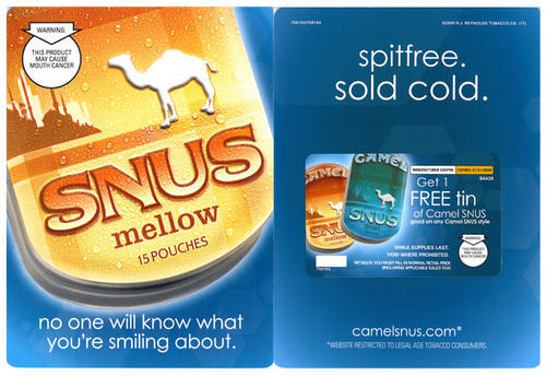 Direct mail piece in promotion of mellow flavored Camel Snus. Coupon for one free tin of Camel Snus included. Text: "no one will know what you're smiling about."