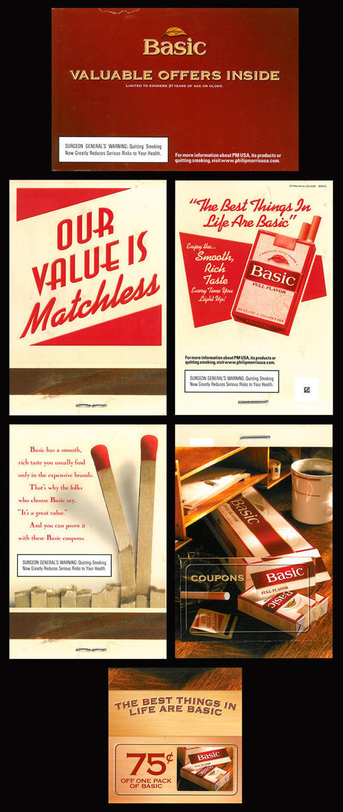 Direct mail from Basic in promotion of the brand's value. Cover of piece mimics the image of a matchbook. The piece came with three coupon: one $.75 off a pack coupon; one $5.00 off a carton coupon; one $4.00 off a carton coupon. Text: "Basic has a smooth, rich taste you usually find only in the expensive brands. That's why the folks who choose Basic say, 'It's a great value.' And you can prove it with these Basic coupons."