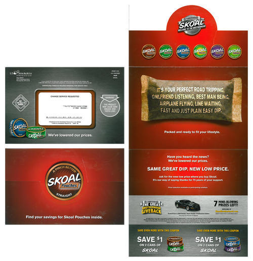 Direct mail from Skoal in promotion of Skoal pouches, the brand's new lower prices, and the ongoing 75th Anniversary Brotherhood Giveback sweepstakes. Piece included two coupons each for $1.00 off two cans of Skoal.