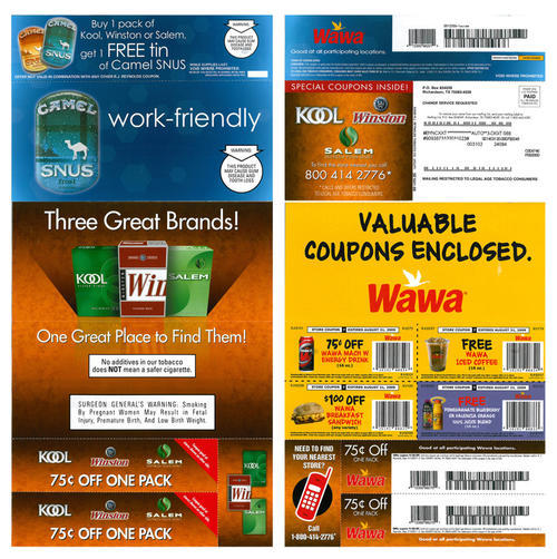 Direct mail advertising Kool, Winston and Salem cigarettes in joint promotion with Wawa convenience stores, providing two cigarette coupons good at all participating Wawa locations. Piece also includes two additional coupons for Wawa food items. This piece also promotes Camel Snus, and provides a coupon for a free tin with the purchase of a pack of Kool, Winston or Salem. This coupon is also valid only in participating Wawa stores.