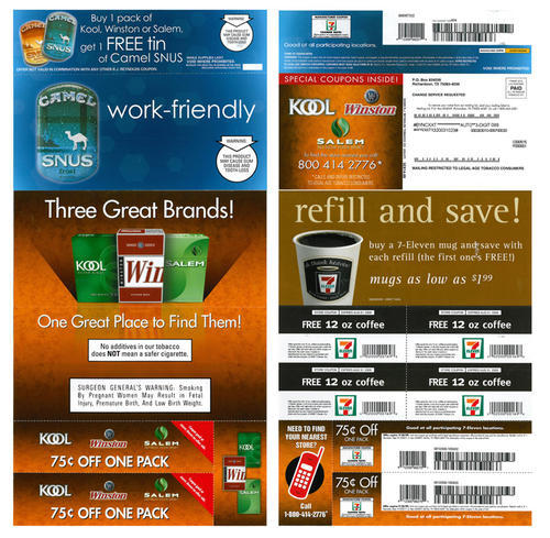 Direct mail advertising Kool, Winston and Salem cigarettes in joint promotion with 7-11 convenience stores, providing two cigarette coupons good at all participating 7-11 locations. Piece also includes two additional coupons for 7-11 food items. This piece also promotes Camel Snus, and provides a coupon for a free tin with the purchase of a pack of Kool, Winston or Salem. This coupon is also valid only in participating 7-11 stores.