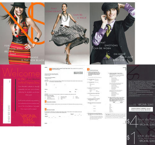 Direct mail from Virginia Slims featuring several images of women and welcoming the receiver to the "oh-so-fabulous world of Virginia Slims". The piece included two coupon and a small gift - a pad of post-it notes with the words "ever so chic" on it. A survey was also included. The piece directed receivers to "fill out the enclosed survey so we can send you even more of the oh-so-fabulous."