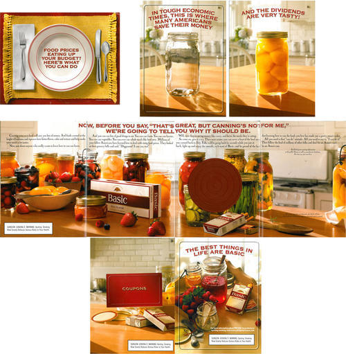 Direct mail from Basic providing tips on one way to save money in tough economic times - canning your own food. Piece comes with a gift of a rubber grip for twisting open jars/cans as well as 3 cigarette coupons (one for $0.75 off a pack, one for $4.00 off a carton, and one for $5.00 off a carton).