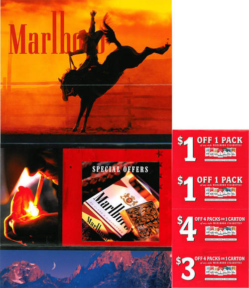 General promotional direct mail from Marlboro, featuring images of landscapes, a cowboy on a horse, and a cowboy lighting a cigarette. Piece includes 4 coupons.