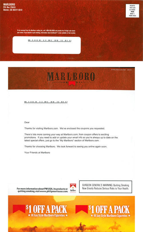 Direct mail letter from Marlboro thanking the receiver for visiting the brand's website (Marlboro.com) and providing two cigarette coupons that were offered on the website - two coupons for $1.00 off a pack.
