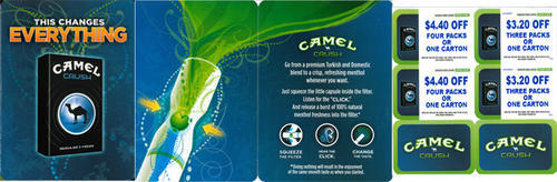 Piece also includes four coupons for Camel Crush (2 coupons for $4.40 off four packs or one carton and 2 coupons for $3.20 off three packs or one carton).