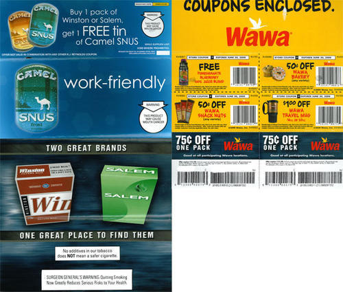 Direct mail advertising both Winston and Salem cigarettes in joint promotion with Wawa convenience stores, providing two cigarette coupons (each for $.75 off a pack) good at all participating Wawa locations. Piece also includes four additional coupons for Wawa food items. This piece also promotes Camel Snus, and provides a coupon for a free tin with the purchase of a pack of Winston or Salem. This coupon is also valid only in participating Wawa stores.