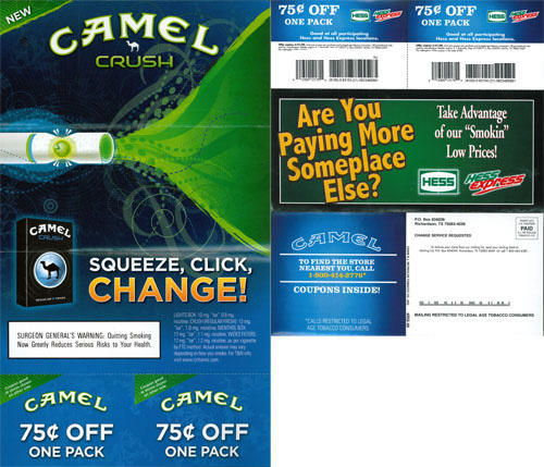 Direct mail received in April 2009 in promotion of Camel's line extension, Camel Crush, a cigarette which can be adjusted from a non-menthol to a menthol flavored cigarette by squeezing and crushing a capsule in the cigarette's filter. "Squeeze, Click, Change!". Piece is in joint promotion with Hess convenience stores, providing two cigarette coupons good at all participating Hess locations.
