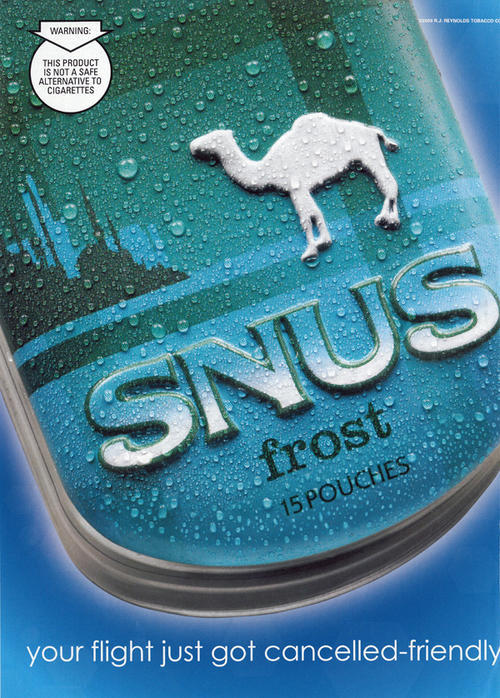 Magazine ad in promotion of Frost flavored Camel Snus, featuring a large image of the tin package. The tin is covered with beads of water, a reference to the fact that the product is sold cold. Underneath the image are the words: "your flight just got cancelled-friendly".