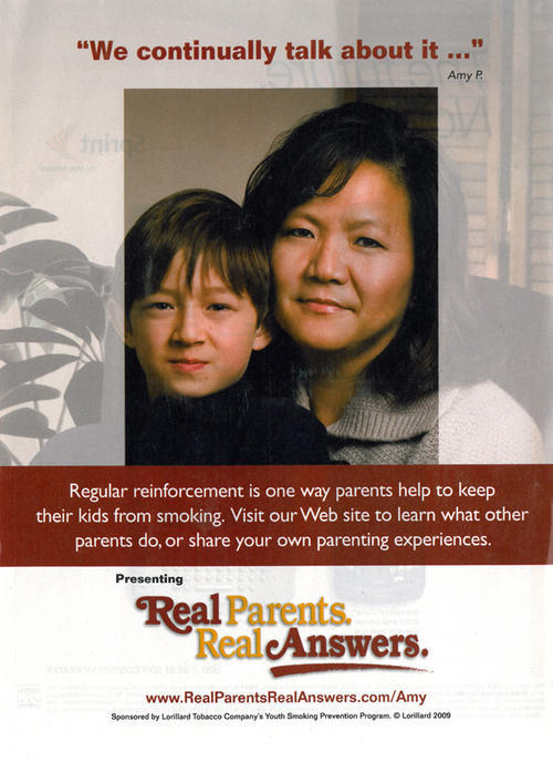 Ad from Lorillard tobacco company, as part of the company's youth smoking prevention program, encouraging parents to talk to their children about smoking. Ad features an image of an Asian mother and son. Text: 'We continually talk about it'.
