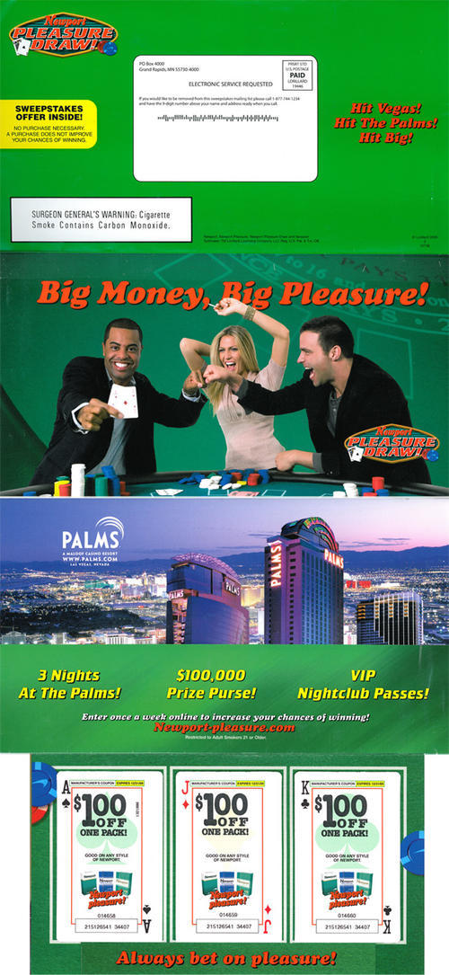 Direct mail from Newport in promotion of the Newport Pleasure Draw!, a sweepstakes for a chance to win a trip to Las Vegas, and to then participate in a Blackjack Tournament for cash prizes ($25,000 grand prize). The piece comes with an entry form but also points out that you can enter every day online at Newport's brand website. Piece also comes with three cigarette coupons, each for $1.00 off a pack.