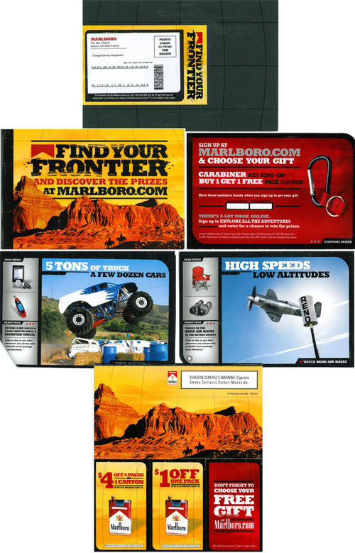 Direct mail from Marlboro, in promotion of the brand's new website and new featured sweepstakes, "Find your Frontier", featuring six adventure themed grand prizes over 6 weeks, as well as smaller available Marlboro gear prizes. Receivers are directed to visit the brand website, marlboro.com, to explore these "adventure" opportunities. The piece also comes with another incentive to visit and register at the website - a promotional code to either redeem a buy one get one free pack coupon, or a carabiner key ring gift. The piece also included two coupons - one for $1.00 off a pack and one for $4.00 off 4 packs or 1 carton.