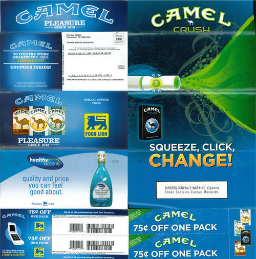 Both sides of a direct mail brochure in promotion of Camel Crush (a cigarette which can be adjusted from a non-menthol to a menthol cigarette by squeezing a capsule in the cigarette's filter - "Squees, Click, Change!"). This direct mail piece is in joint promotion with Food Lion convenience stores, providing two cigarette pack coupons good at all participating Food Lion locations. The piece also provides a phone number to call for help in locating the store nearest you.